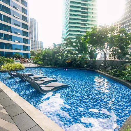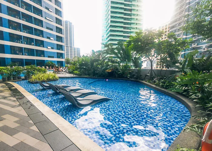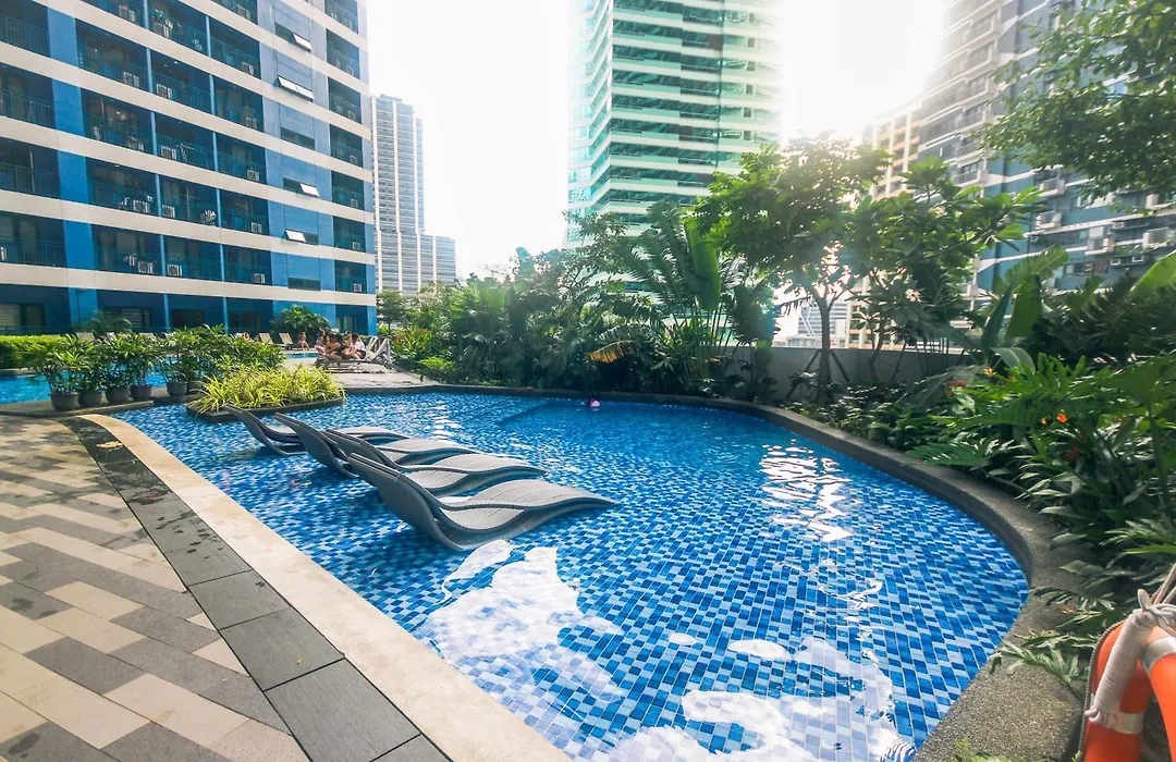 寝室1室のChic Romantic Getaway Makati Studio One Br Two Br Swim Gym 300 Mb マニラ市はInternational Baptist Church of Manilaから歩いて5分の場所に位置し、プールの景色を見渡せます。 38m²のアパートはワシントンシップパークからたった1.3kmで、ニノイ・アキノ国際空港までは車で20分です。